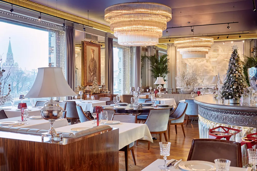 В ослепительной “Белуге” из-за изобилия осетровой, стерляжьей, севрюжьей икры и моря шампанского из богатейшей коллекции ресторана будет даже не до вида на Кремль. Также в меню – буженина из осетрины с белыми груздями, паштет из оленины, мимоза с белугой, оливье с колбасой из осетра, студень из краба, кологривский гусь и торт «Прага» с черной икрой, который приготовит шеф-кондитер Никита Гавриленко. Гостей обещают развлекать до утра джазмены и диджей.