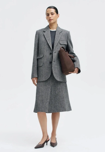 Модели с акцентной линией плеч и чуть удлиненным кроем. Цвет — графитовый, карамельный, темно-шоколадный. Если хочется прямой отсылке к 80-м, то присмотритесь к классическим принтам той эпохи: пинстрайп или мелкая клетка.