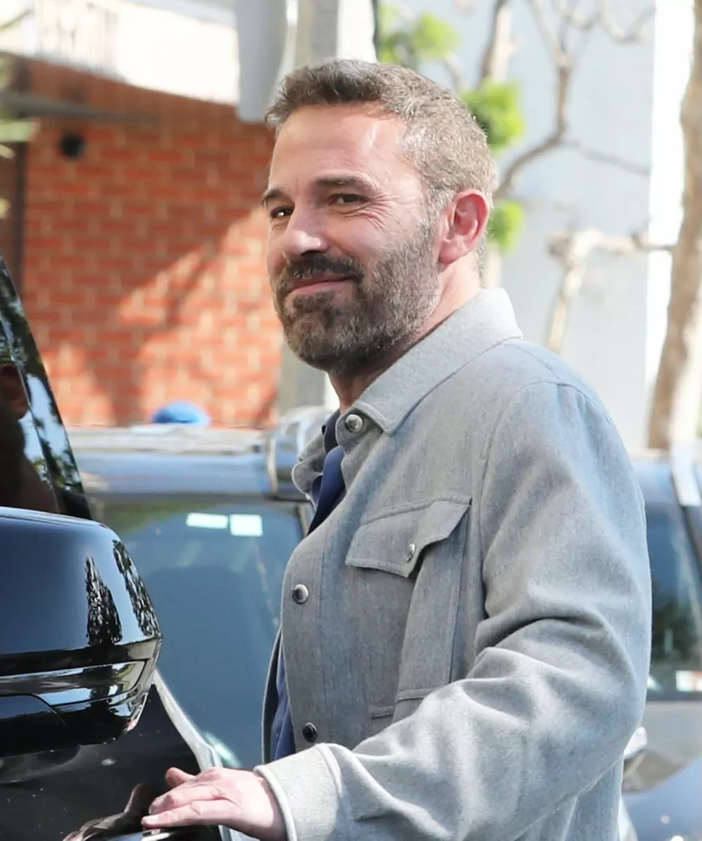 На прогулке Аффлек был одет в темно-синие джинсы, темно-синюю рубашку и светло-серую куртку, дополнив образ кроссовками в тон.