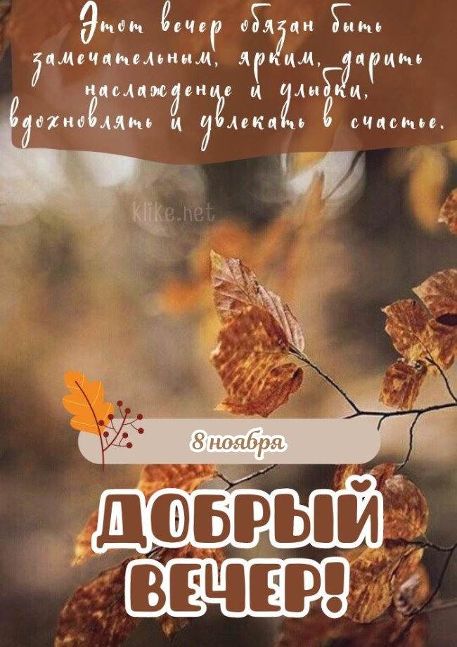 Прикольная подборка — картинки и открытки на 8 ноября: волшебные и благоприятные пожелания на утро, день, вечер и ночь. Замерзшая земля покрылась тонкой коркой, предвещая скорое наступление более сурового времени. Желаю вам такой же мудрой подготовки к предстоящим переменам, сохраняя при этом гибкость и способность адаптироваться.