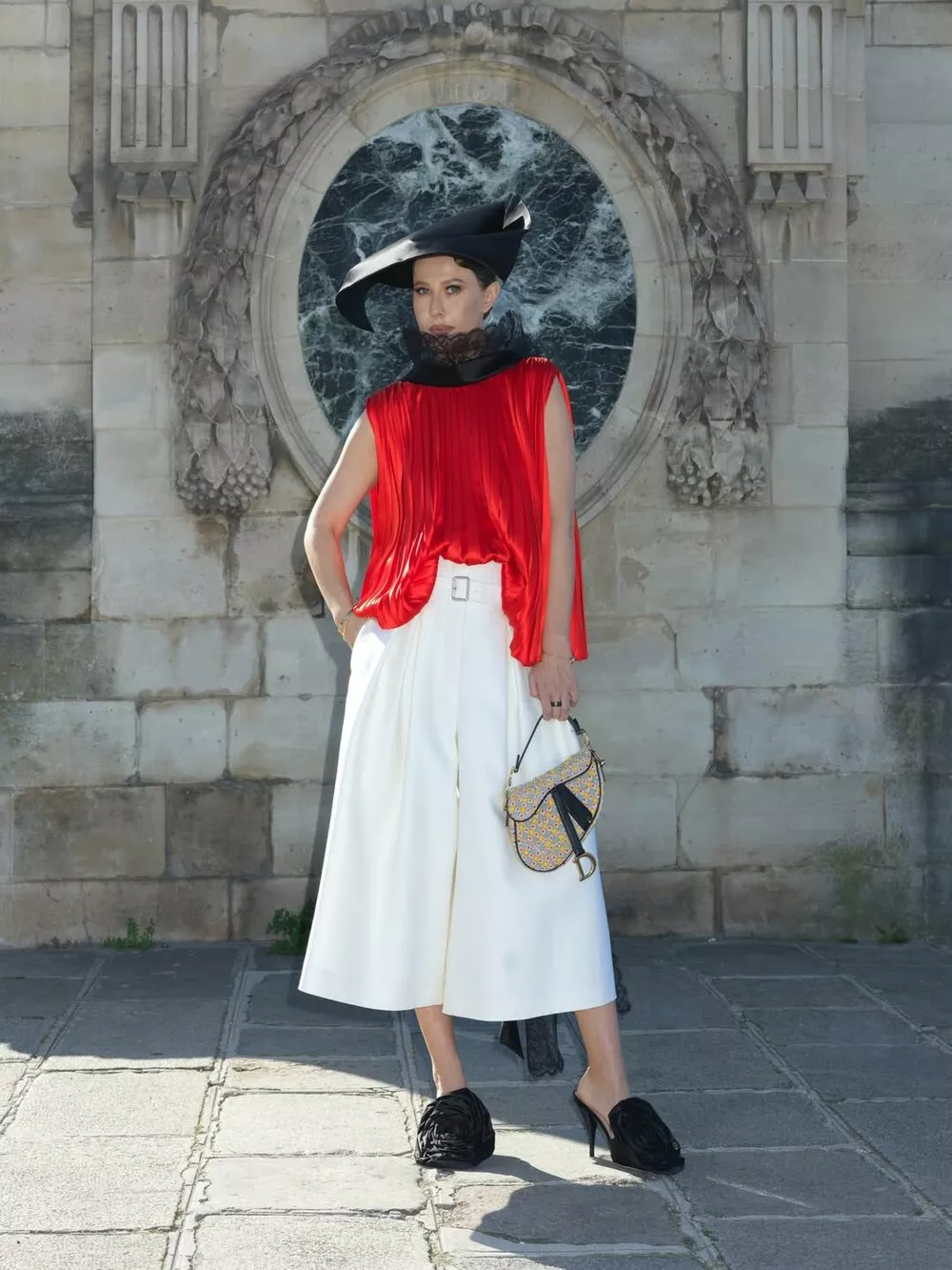 Мы уже рассказали о том, как встретились на шоу Dior Рената Пиотровски и Анна Александрова, а теперь покажем эффектный образ Ксении Собчак с того же показа. Подопечная стилистов Миши и Китти примерила аутфит из новой коллекции бренда: белые кюлоты с высокой посадкой и плиссированную алую блузку без рукавов с черным кружевным жабо, а также авангардную “треуголку” и мюли на каблуке с объемными мысами в форме черных роз. Образ дополняла миниатюрная разноцветная сумка-седло от Dior.