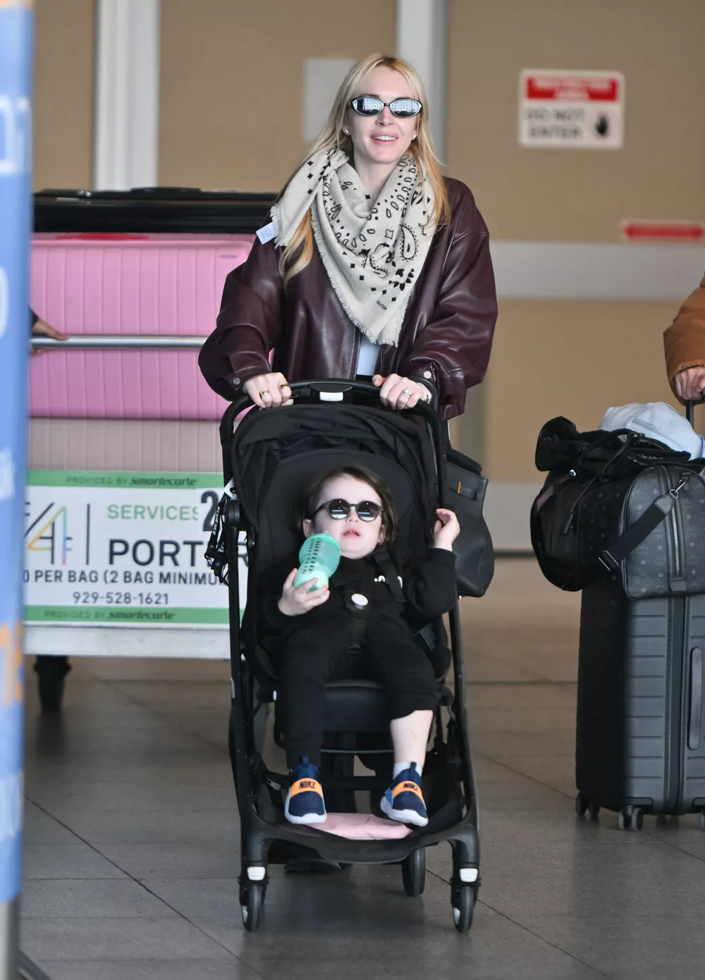 В нью-йоркском аэропорту Линдси и Бадер выглядели расслабленными и широко улыбались местным папарацци. Лохан, одетая в черные спортивные брюки с лампасами, коричневую кожаную куртку-пилот и молочный платок с этническим рисунком, везла в коляске 2-летнего сына. Звездная мама надела на мальчика темные очки, чтобы защитить его глаза от весеннего солнца.