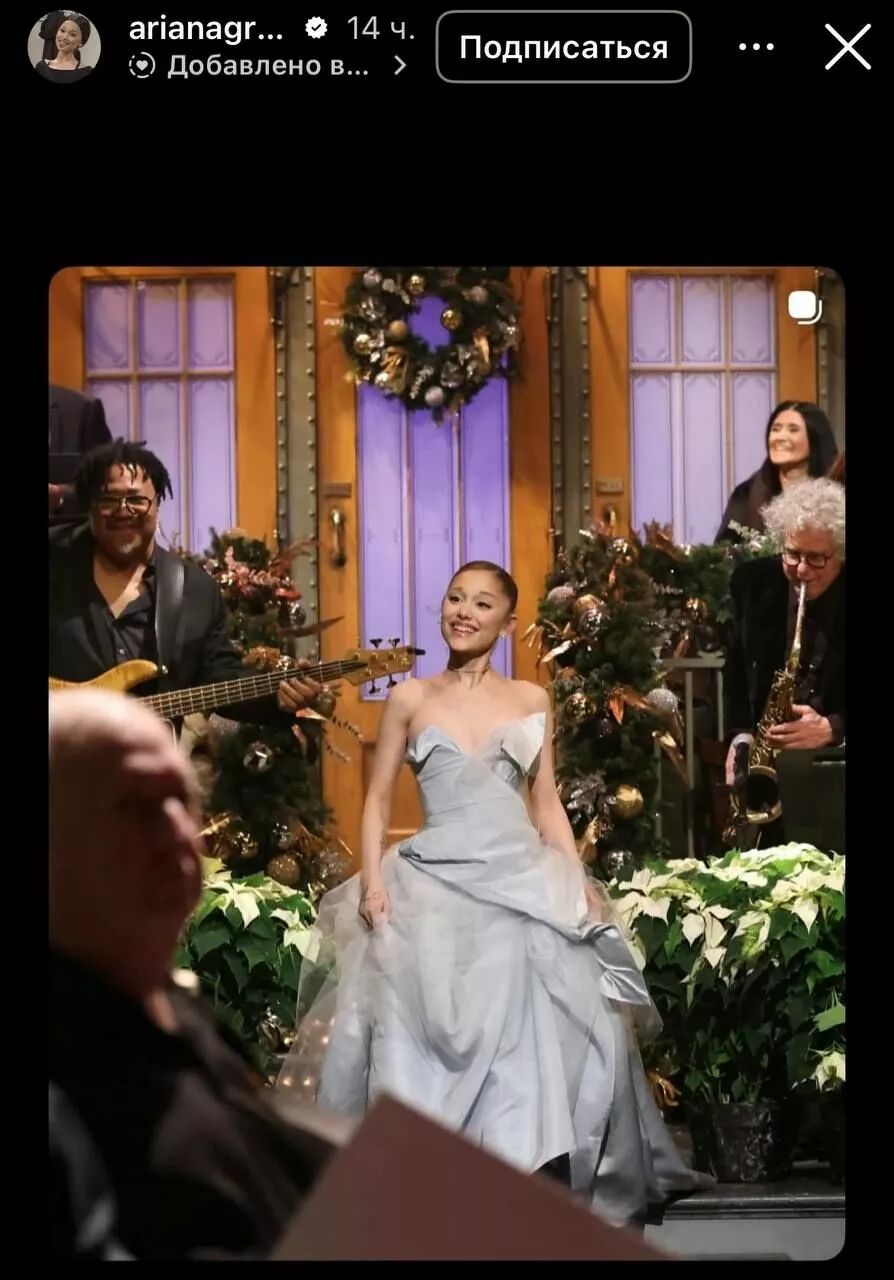 Ариана Гранде нарядилась в платье без бретелек от Vivienne Westwood, чтобы провести специальный праздничный выпуск шоу “Saturday Night Live”. Ариана сделала пародию на песню Мэрайи Кэри “All I Want for Christmas Is You” и выступила на одной сцене с Шер. Ранее Гранде уже пародировала Дженнифер Кулидж и Селин Дион в программе “SNL”.