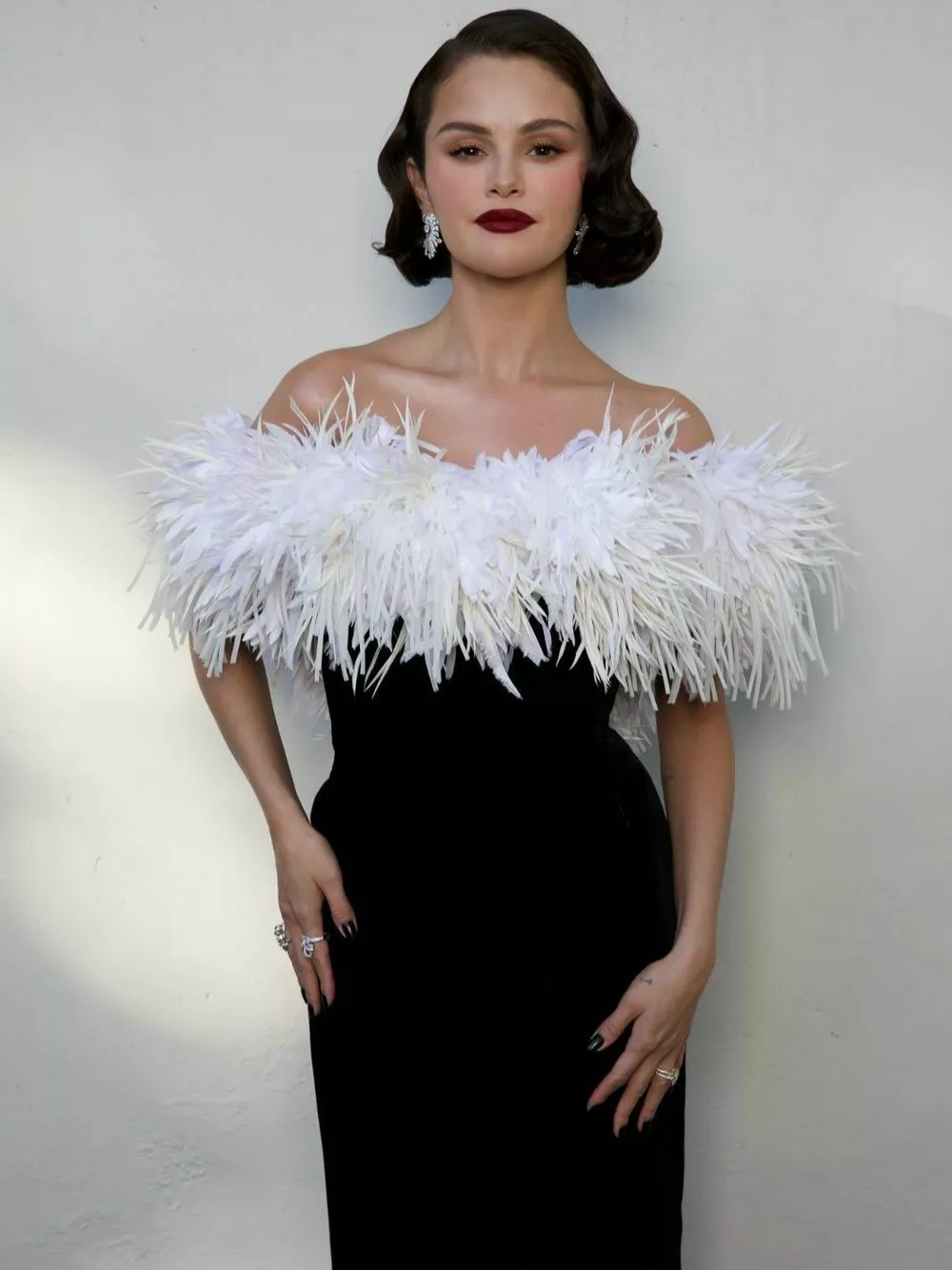В своем образе 33-летняя Селена отдала предпочтение классическому голливудскому шику. Артистка примерила черное платье из тяжелого бархата с открытыми плечами и белоснежной перьевой отделкой в области декольте. Наряд дополняли крупные бриллиантовые серьги, по форме напоминающие цветы, бриллиантовые кольца, включая обручальное, и черный матовый маникюр. Гомес уложила свою стрижку каре мягкими волнами в стиле 1920-х и нанесла на губы помаду винного оттенка.