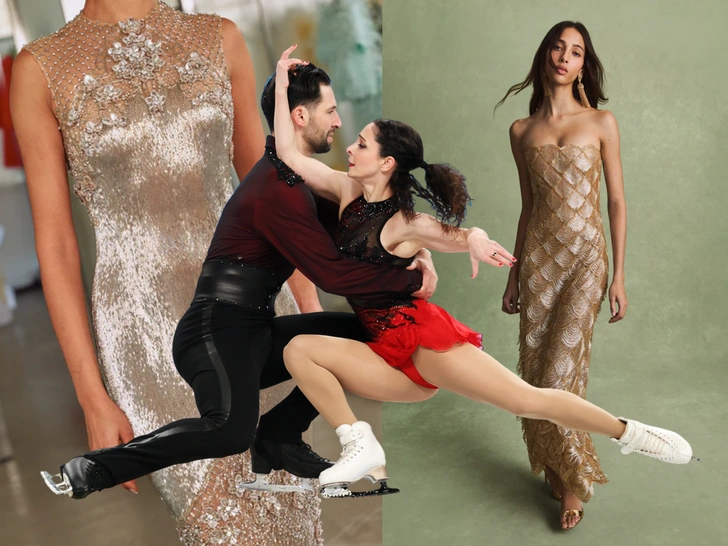 Первый образ, который удалось создать, — золотой костюм, напоминающий скорее платье с красной дорожки «Оскара». И, кстати, отнюдь не случайно, ведь крайне похожий наряд есть в коллекции бренда для весны-лета 2026. В оригинале это платье-колонна без бретелей. Оно выполнено из сетки телесного оттенка и украшено деталями из сотен, а может быть, и тысяч золотых цепочек. Однако для льда его пришлось трансформировать: юбка укоротилась до положенной фигуристкам длины, а сверху добавился воротник-стойка и короткие рукава.