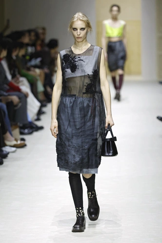 Первым делом в глаза бросаются «повидавшие виды» вещи: затертые куртки и плащи, мятые рубашки и юбки из органзы, проглядывающая из прорех разноцветная ткань. Последний прием, к слову, вдохновлен искусством. В живописи наслоенная друг на друга краска зовется pentimento — это знак того, что художник передумал в процессе работы и решил переписать часть картины. И Prada водружает поверх еще один уровень «несовершенности». Теперь из подиумных вещей нарочито торчат нитки, края тканей остаются необработанными, а дыры становятся полноценным декором.